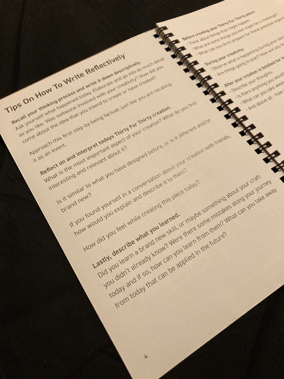 A reflective journal is a useful tool for recording your thoughts and ideas. During the Thirty For Thirty challenge, you can use our Reflective Journal to document your design process and creative ideas. This can help you identify learning events and moments of inspiration that occur during the challenge.